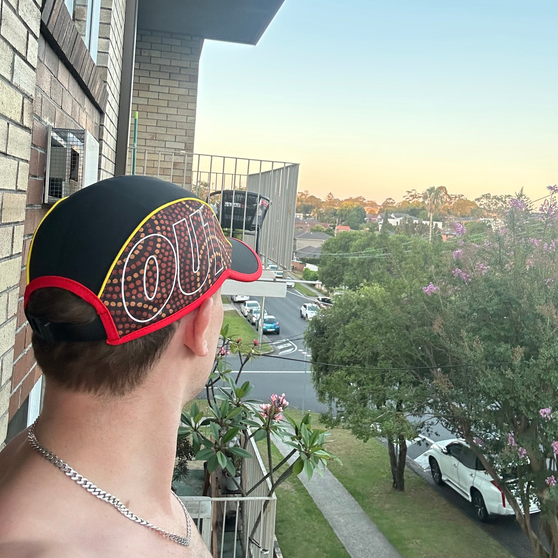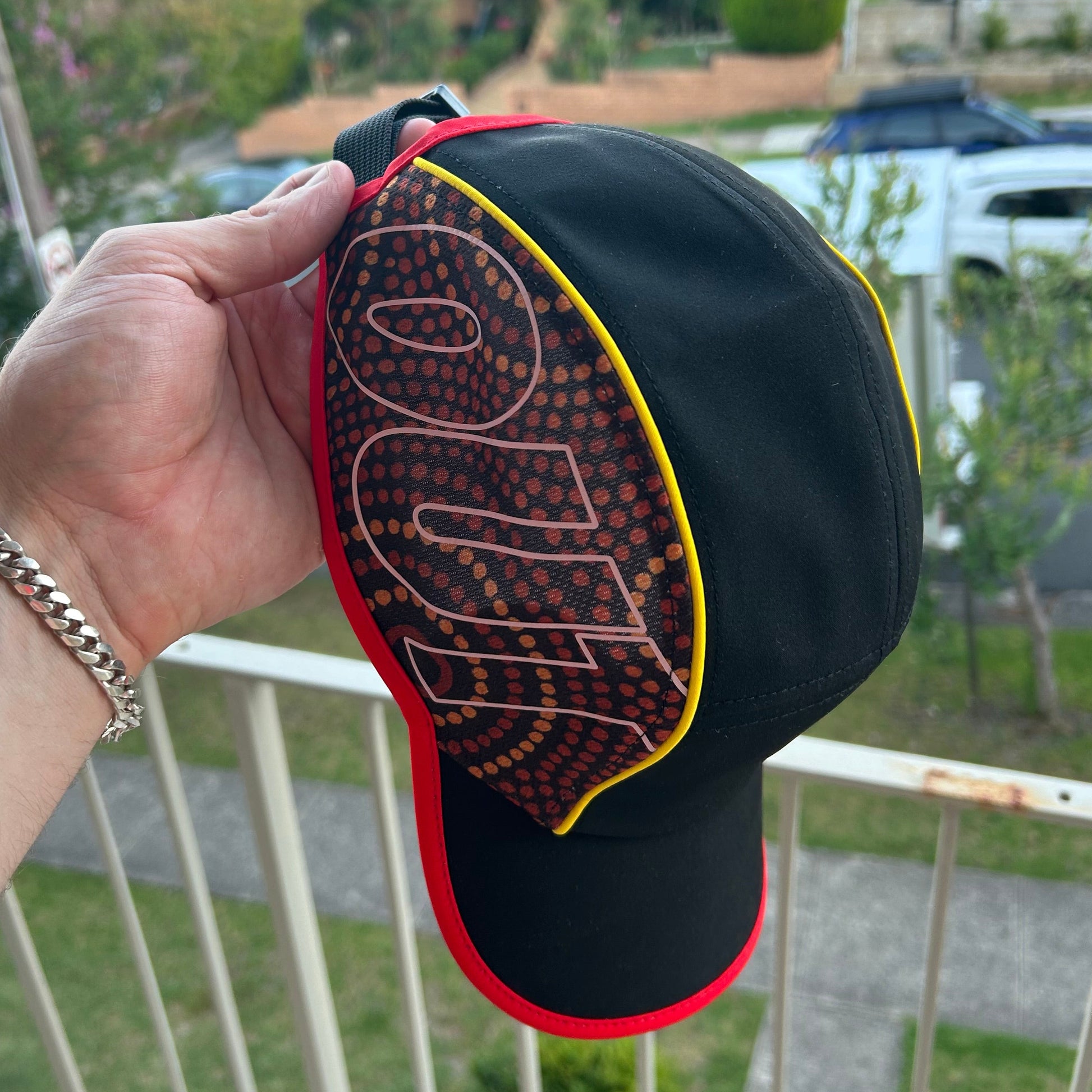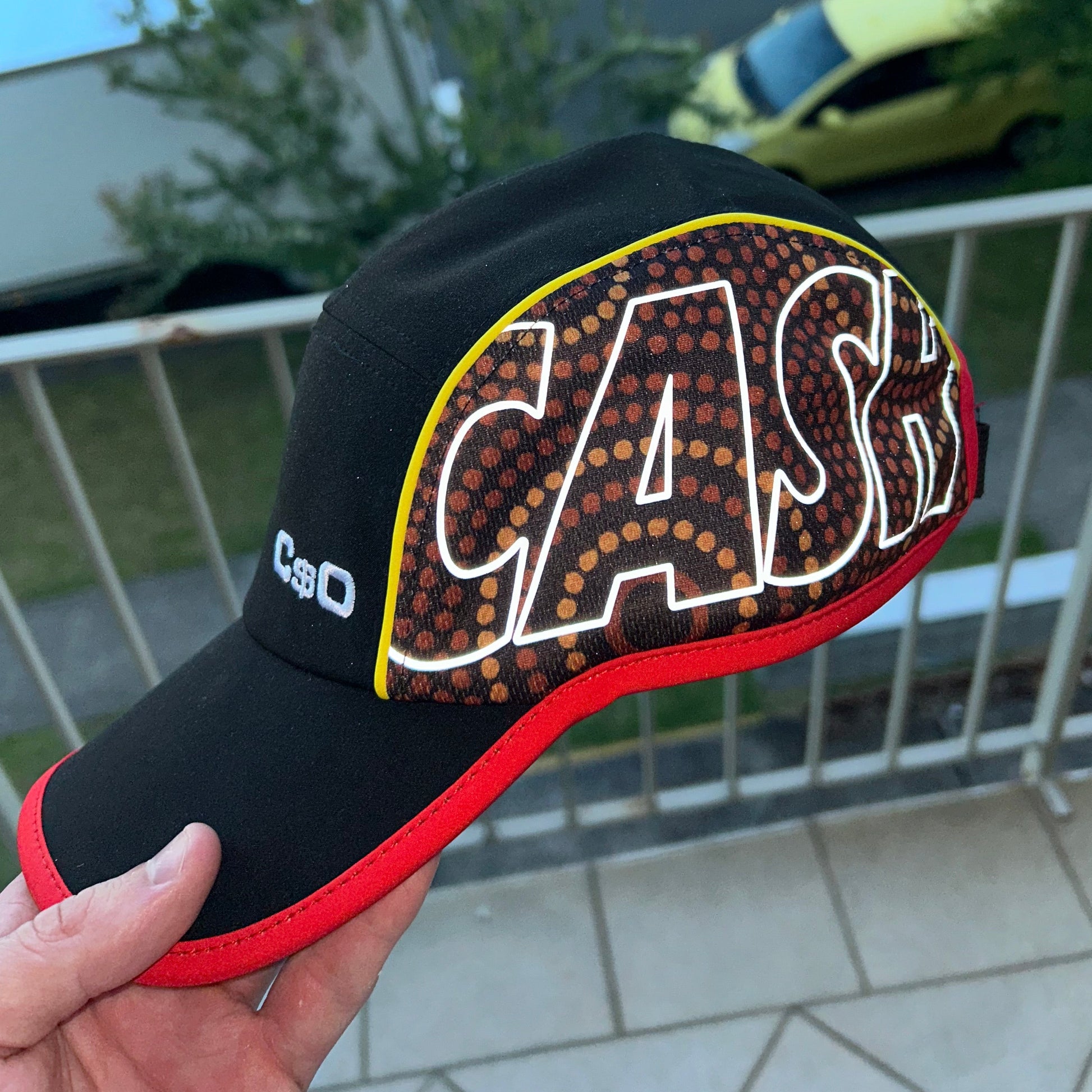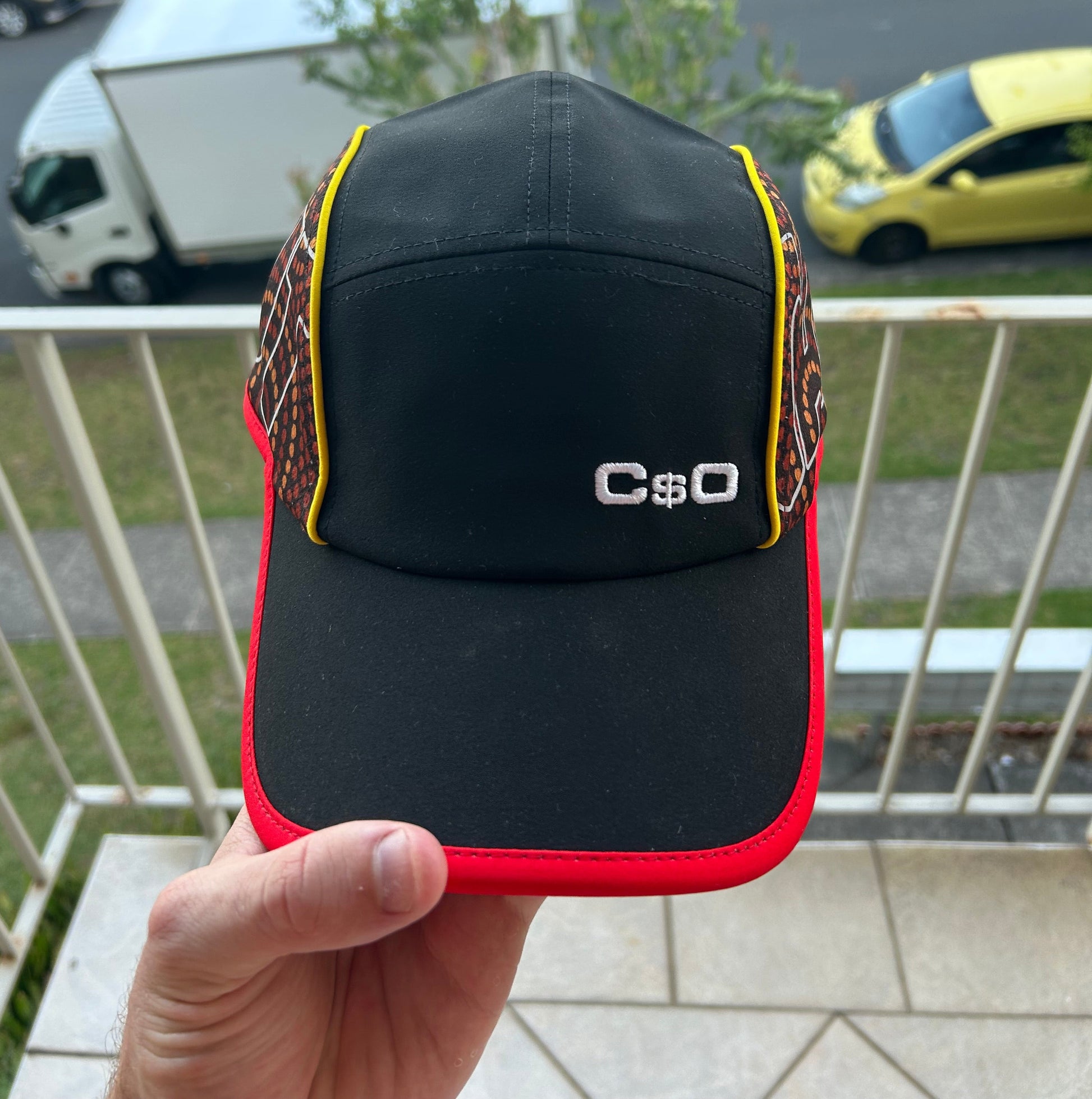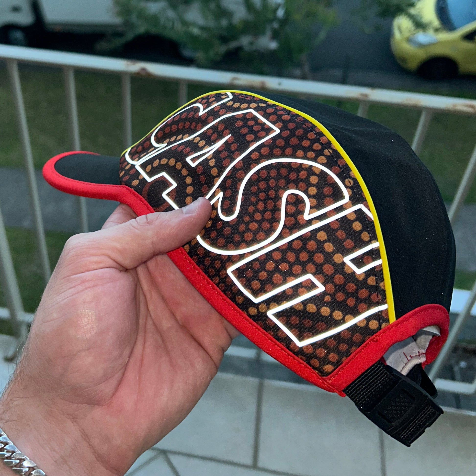 Featuring lightweight performance nylon, yellow and red piping, embroidery on the front panel, reflective print on the side mesh, and an adjustable strap.